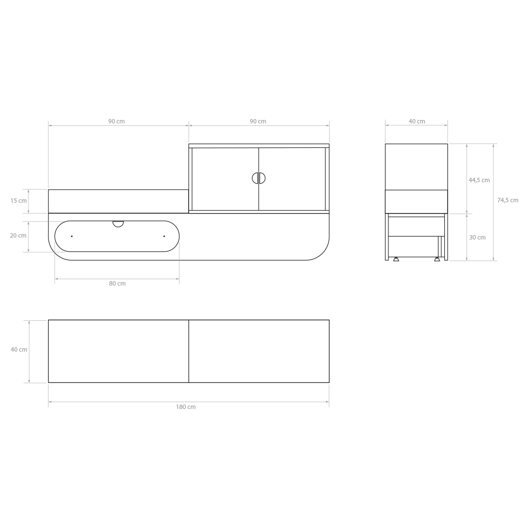 O conjunto 184 x 42 x 103 cm integra armário push to open, prateleira interior e gavetão inferior para mantas ou têxteis de trabalho.