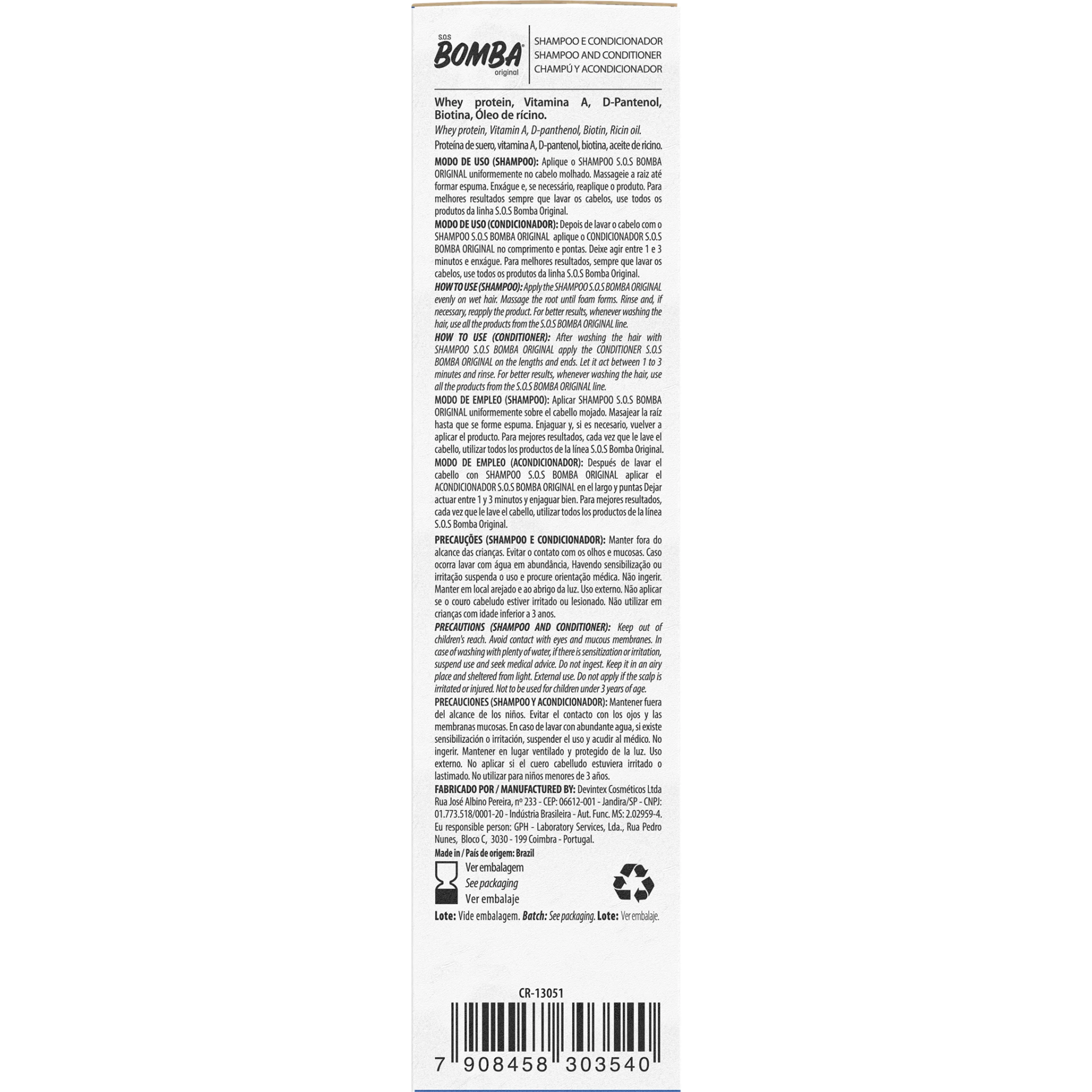 Acondicionador S.O.S Bomba Original: después de lavar el cabello con champú, aplique el Acondicionador S.O.S Bomba Original en largos y puntas. Dejar actuar de 1 a 3 minutos y aclarar.