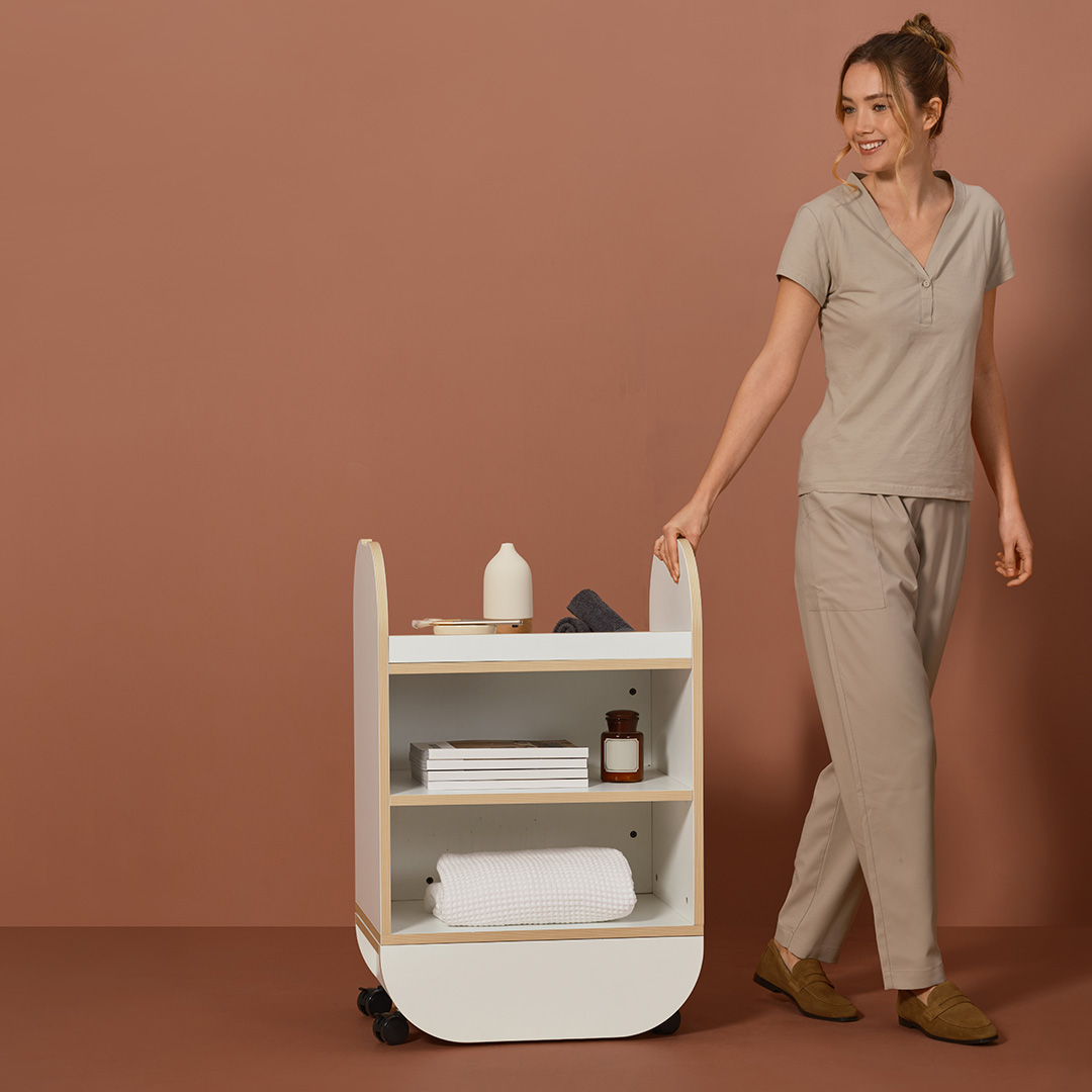 - Rodas 360° com travão: movimentação estável e silenciosa.