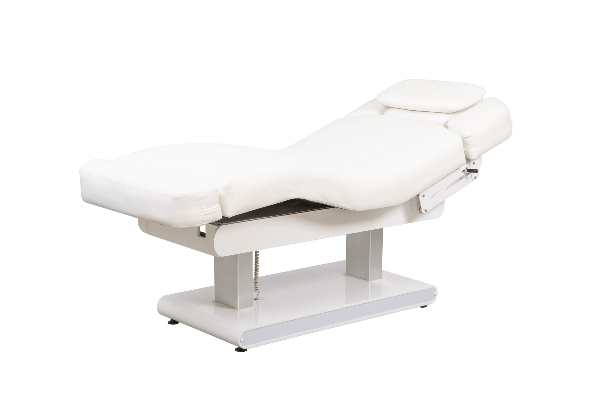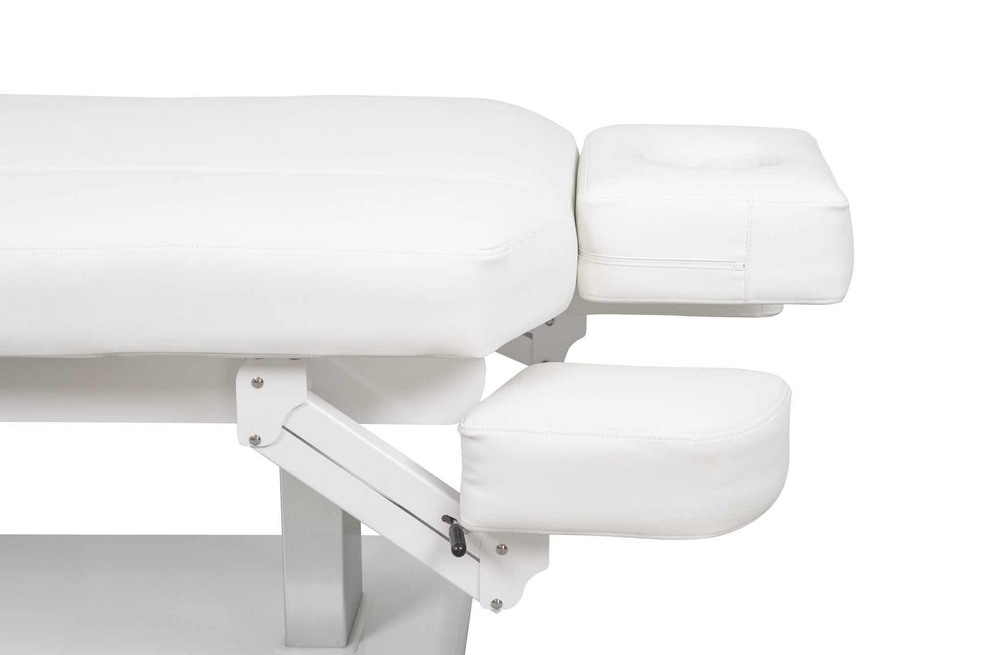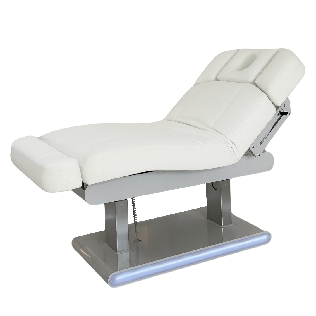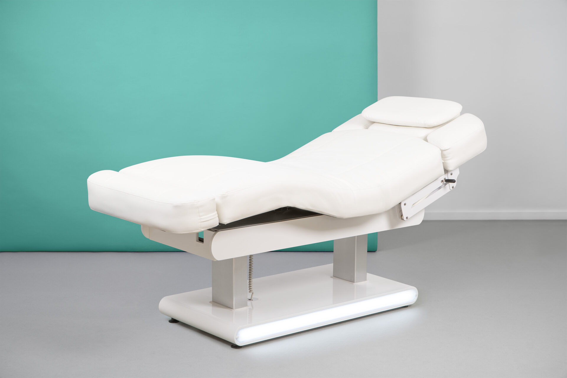 Esta marquesa possui um design inteligente com 3 seções distintas, permitindo ajustes precisos e rápidos para diferentes posições de trabalho. Os apoios de braços são ajustáveis, aumentando a versatilidade e o conforto durante as sessões. Por exemplo, o cabeçalho com orifício facial facilita o posicionamento do cliente em tratamentos faciais e massagens. Além disso, a base está equipada com um sistema de iluminação LED de cores intercambiáveis, que pode ser adaptado para criar a atmosfera perfeita em cada centro, reforçando o ambiente profissional e acolhedor.