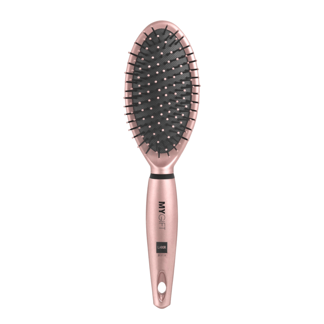 - Escova pneumática com cerdas sintéticas e pontas arredondadas, ideal para desembaraçar com delicadeza todos os tipos de cabelo.