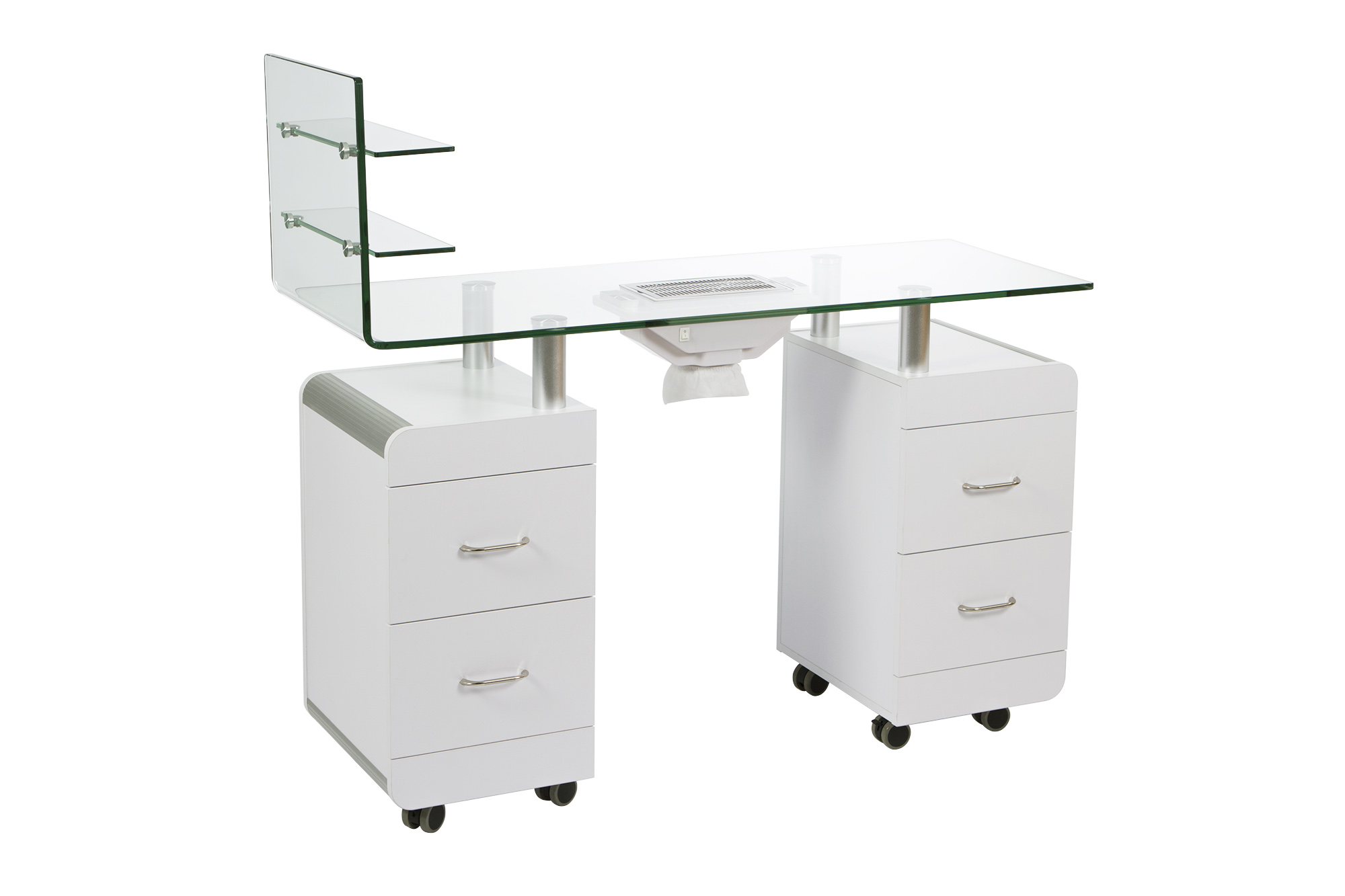 - Organização e Eficiência: A mesa vem com dois módulos de arrumação com gavetas. Como estão montados sobre rodas, facilitam a limpeza do espaço. Além disso, as prateleiras laterais em vidro são perfeitas para expor os seus produtos, mantendo tudo visível e ao alcance.