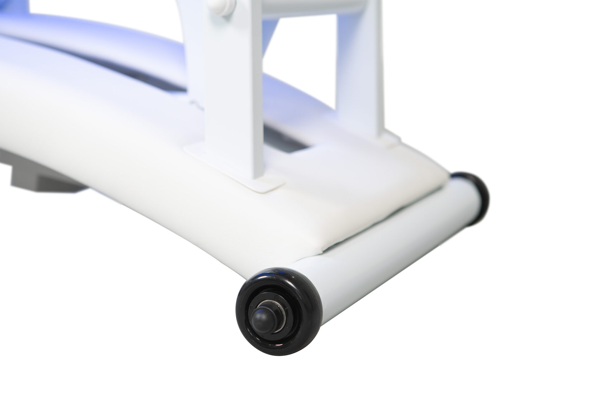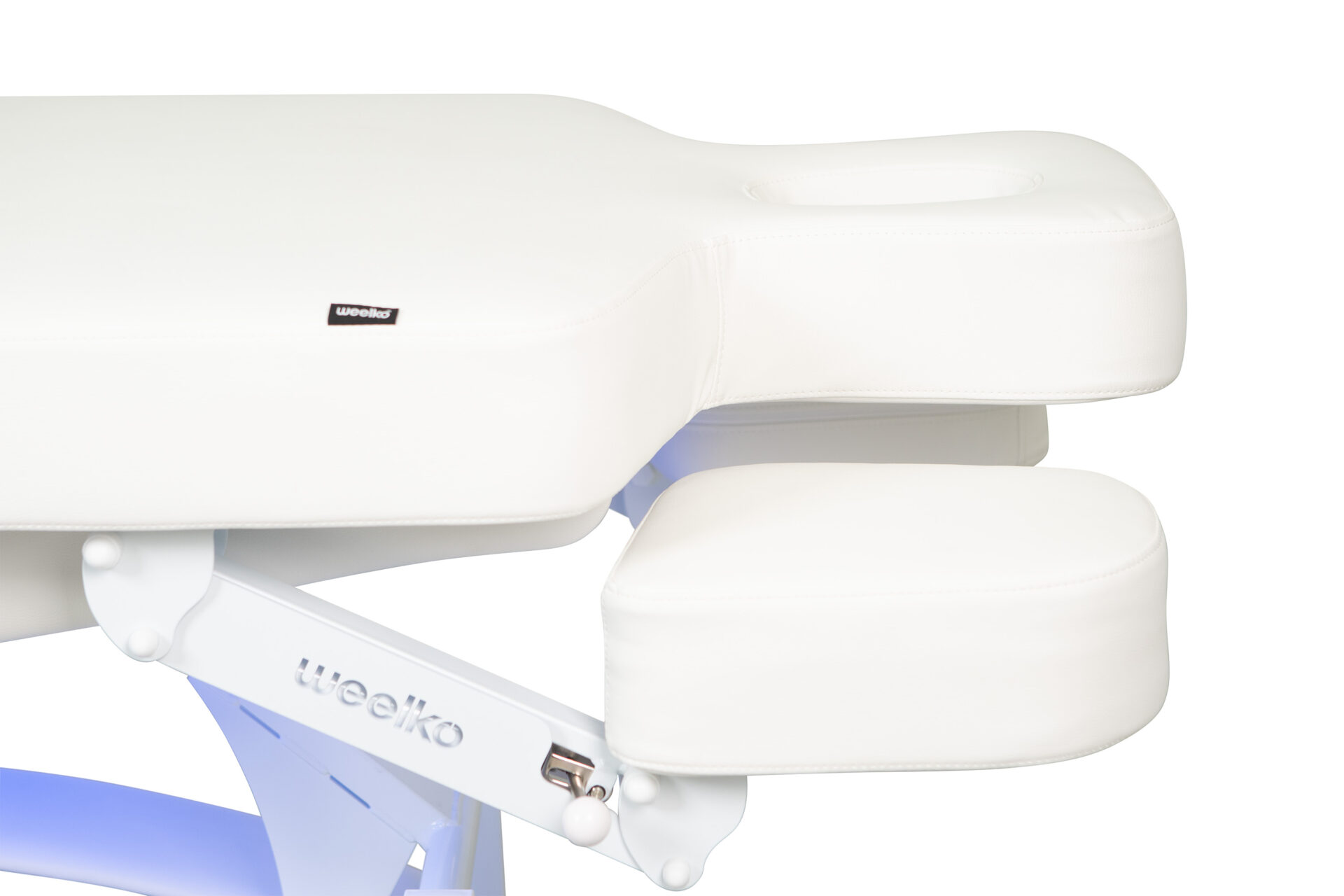 Para maior comodidade, a marquesa inclui apoios de braços ajustáveis, um cabeçal com orifício facial e rodas para facilitar a sua mobilidade dentro do espaço de trabalho.