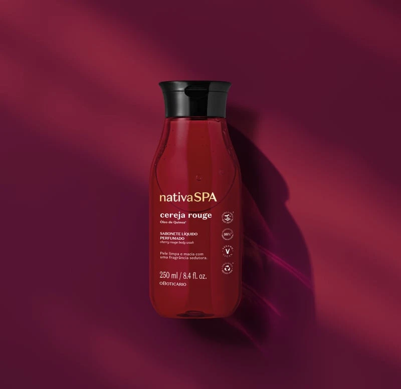 O sabonete líquido Cereja Rouge Nativa SPA transforma o banho num ritual sedutor. Sua fórmula com Óleo 100 % Puro de Quinoa, Extrato de Cereja e 98 % de ingredientes naturais limpa delicadamente, mantendo a hidratação da pele e liberando o acorde oriental-frutal Sexy Cherry.