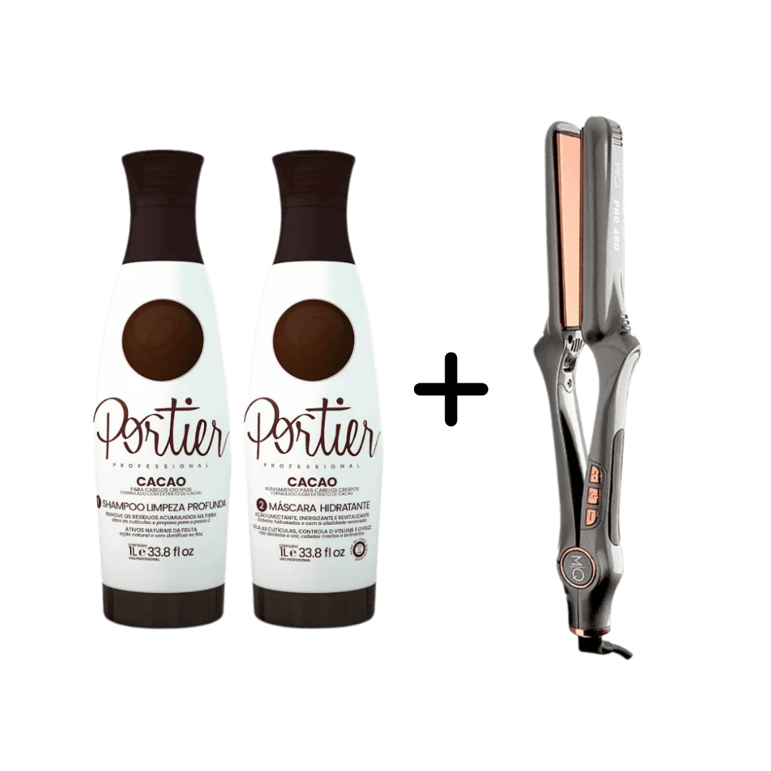 - 1 Shampoo Portier Cacao 1L: Limpa profundamente o cabelo, removendo, assim, os resíduos de produtos acumulados na fibra capilar. Dessa forma, proporciona fios extremamente limpos, com abertura completa das cutículas, prontos para receber o tratamento.